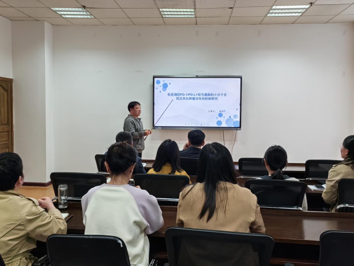 学术交流环节,beat365vip官网登录入口化学教研室张华博士做了题为《免疫调控PD-1/PD-L1信号通路的小分子发现及其抗肿瘤活性和机制研究》的报告,介绍了关于靶向PD-1/PD-L1信号通路的小分子抑制剂的设计合成及结构优化、小分子与PD-L1蛋白的结合模式研究、高活性小分子抑制剂的成药性评价及抗肿瘤机制研究。互动环节,张华博士就2,2-二取代联苯衍生物、咔唑类小分子抑制剂的设计、合成及活性评价等内容与大家进行了探讨和交流。