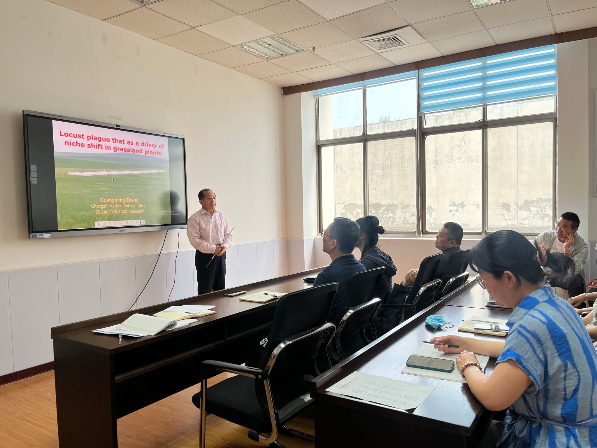 在本期学术报告环节,beat365vip官网登录入口中药资源与鉴定教研室的张光明博士带来了题为《蝗灾对草原植物 C:N:P 化学计量生态位的影响》的精彩分享。张光明博士聚焦内蒙古锡林郭勒草原生态系统,详细汇报了不同程度蝗灾对常见植物C:N:P 化学计量生态位宽度和重叠的影响研究成果,并深入探讨了这些研究对于草原植物资源合理利用的重要意义。报告引发了在场教师的热烈讨论与深入思考。